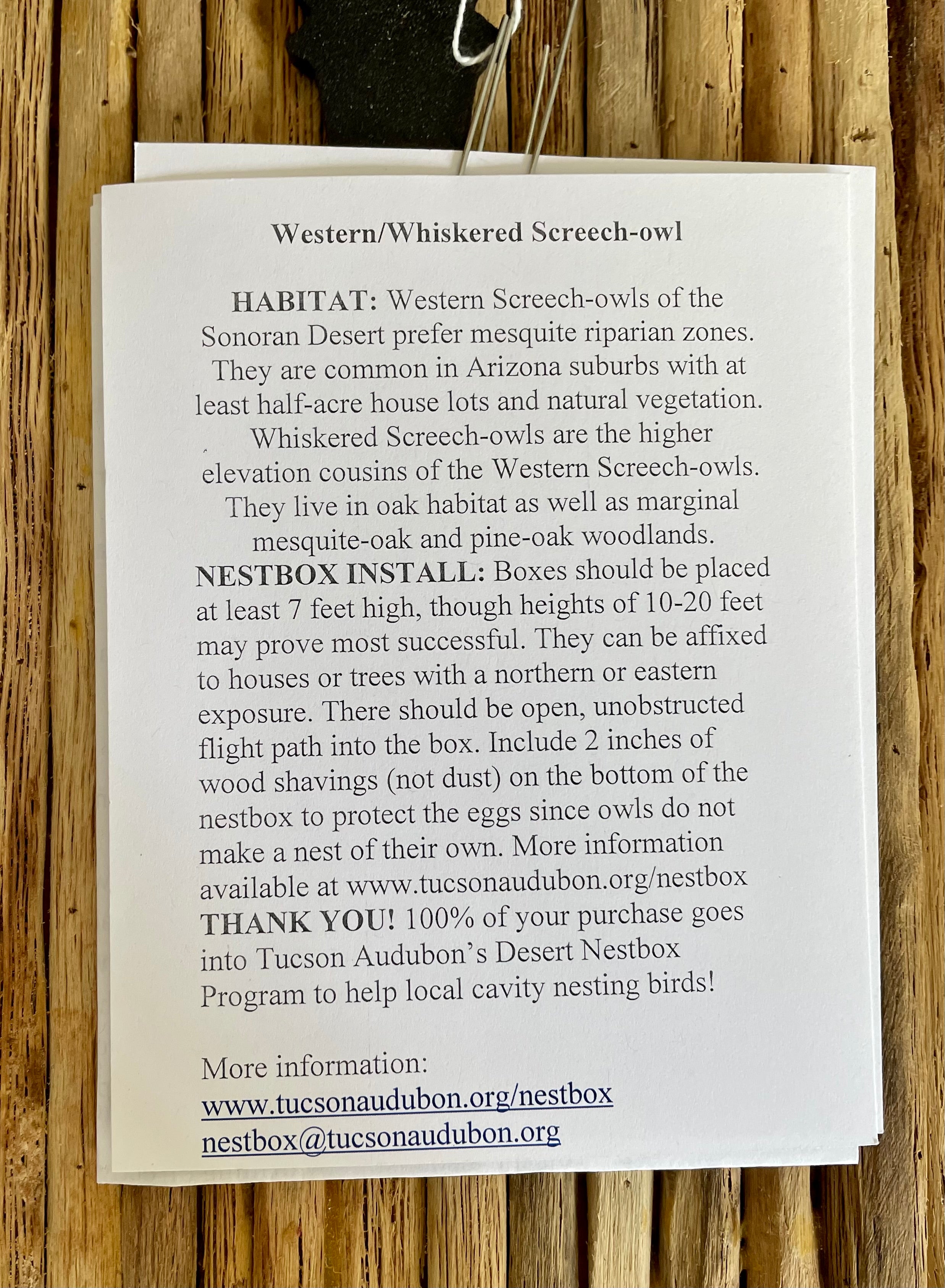 Installation instructions are included with the nestbox and can be viewed on our website: https://tucsonbirds.org/nestbox
